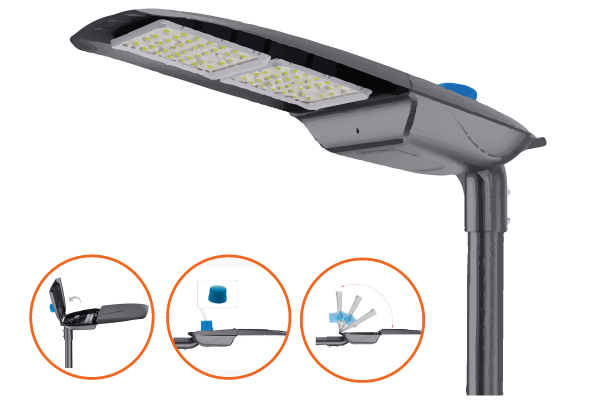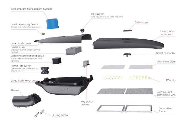 DESCRIPTION High-quality process, streamline shape and exquisite appearance; modular design in light source, easy for installation and maintenance; portable button switch design, one-key switch, simple and convenient, not requiring tools; light-controlled induction technology, realizing intelligent energy saving; design of bat airfoil light distribution, providing even light distribution.